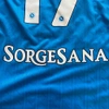 This memorabilia is part of the match supply made available to players during official competitions and is different in its features in relation to the ones sold in fanshops, it could have been worn during the match and washed after the end of the match or prepared for the match but then not used.