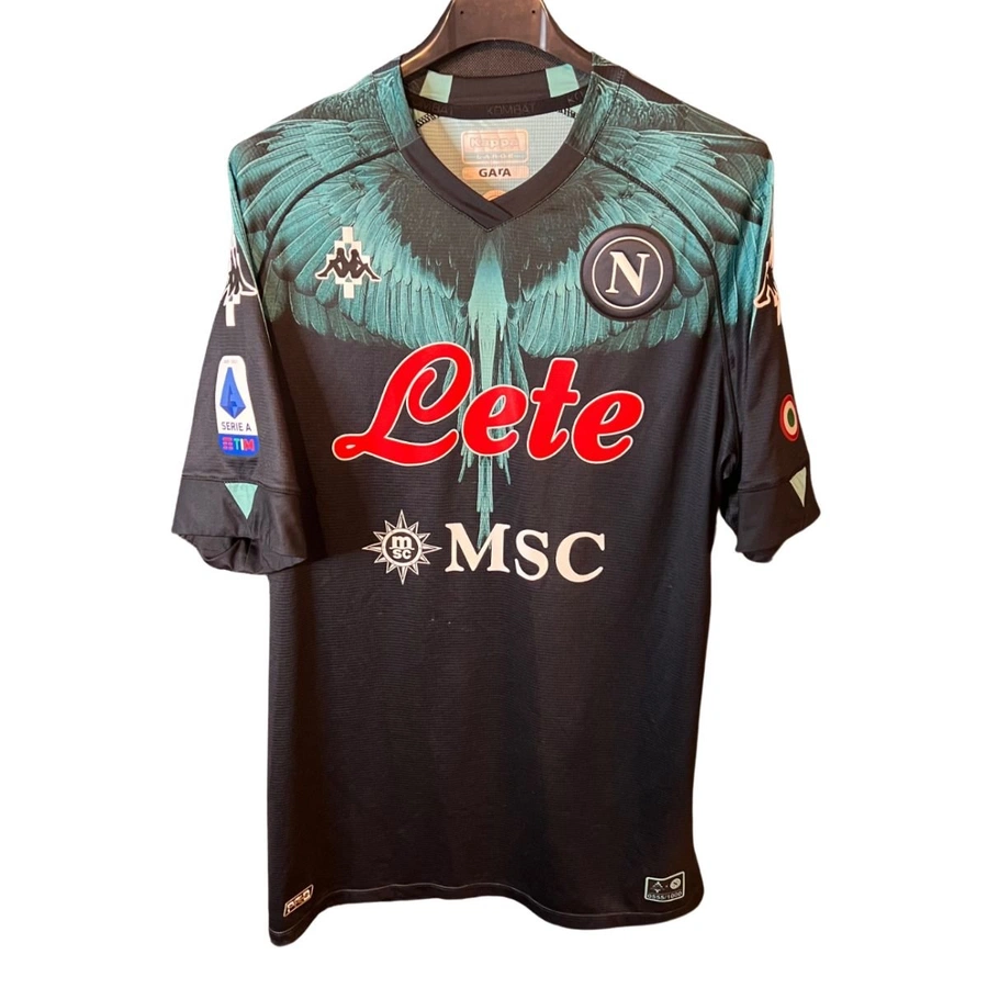 The shirt is a special model born from the collaboration between the sports club SCC Napoli with Marcelo Burlon, and it was used only in this match, valid for the 31st match of Serie A.