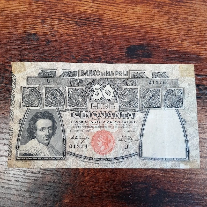 This banknote is a 50 Lire from the Banco di Napoli, a historical piece from the pre-euro era that was issued before the centralization of banknote production under the Bank of Italy.