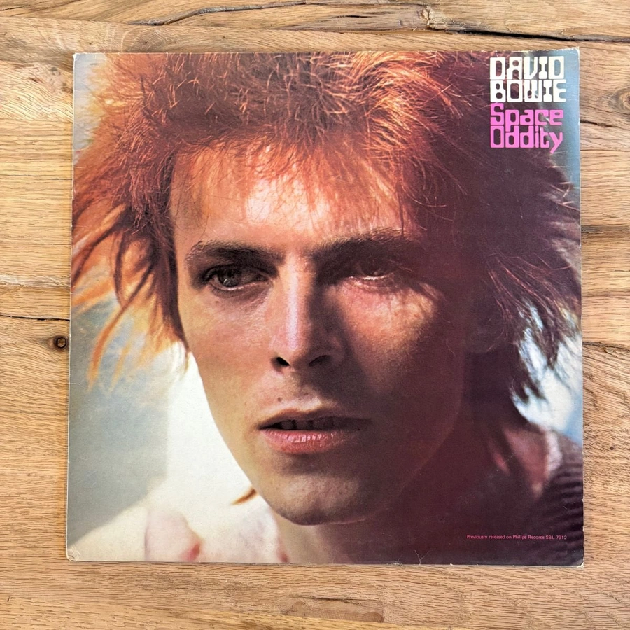 Front Cover: The cover image features a close-up of David Bowie's face, with his trademark messy red hair. The album title, Space Oddity, appears in the top right corner in a futuristic pink and white font.