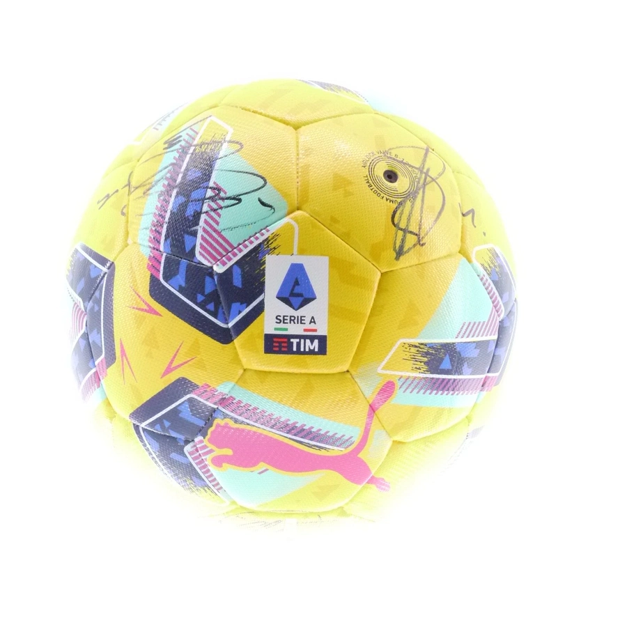 The ball has been signed by Juventus players, including Vlahovic, Chiesa, Bremer.