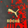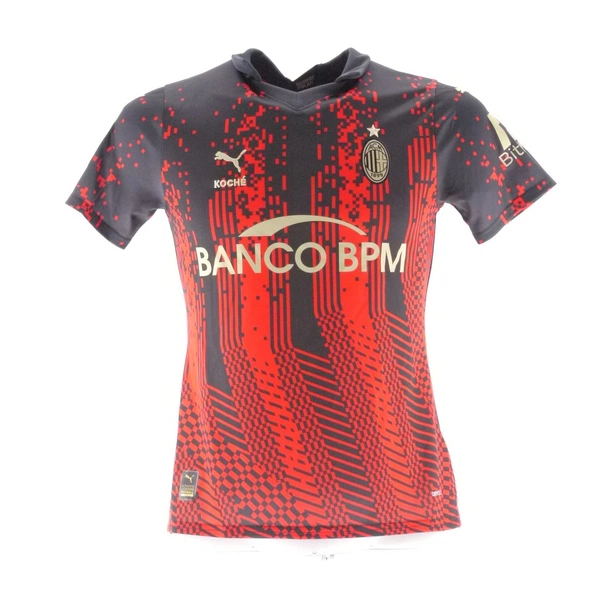 The shirt is a special model in collaboration with the Parisian fashion house Koché and integrates a pixelated, game-ready interpretation of the iconic red stripes of Milan.