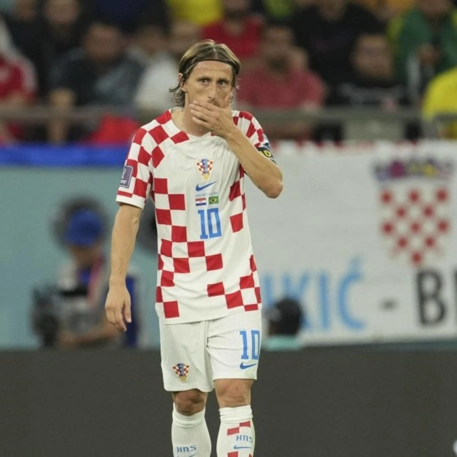 The Croatia match shirt issued/worn by Modric in the match valid for the quarter-finals of the 2022 World Cup against Brazil played on 09/12/22, 2022 season.
