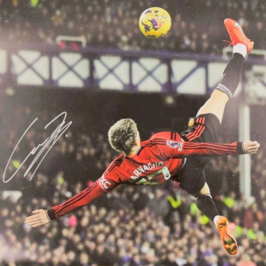Photograph portraying Alejandro Garnacho during his wonderful bycicle kick goal scored in the match against Everton, played on 26/11/2023, valid for the 13th match of Premier League, 2023/24 season.