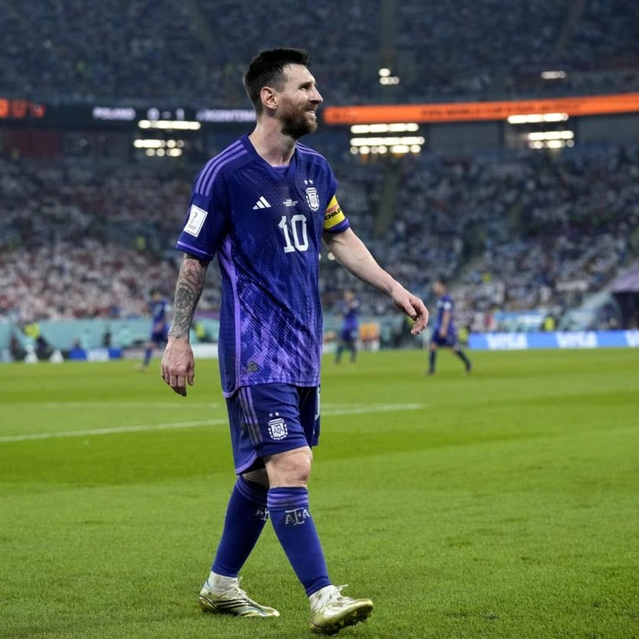 Argentina match kit issued / worn by Messi in the match against Poland played on 30/11/22, valid for the group stage of the 2022 World Cup.