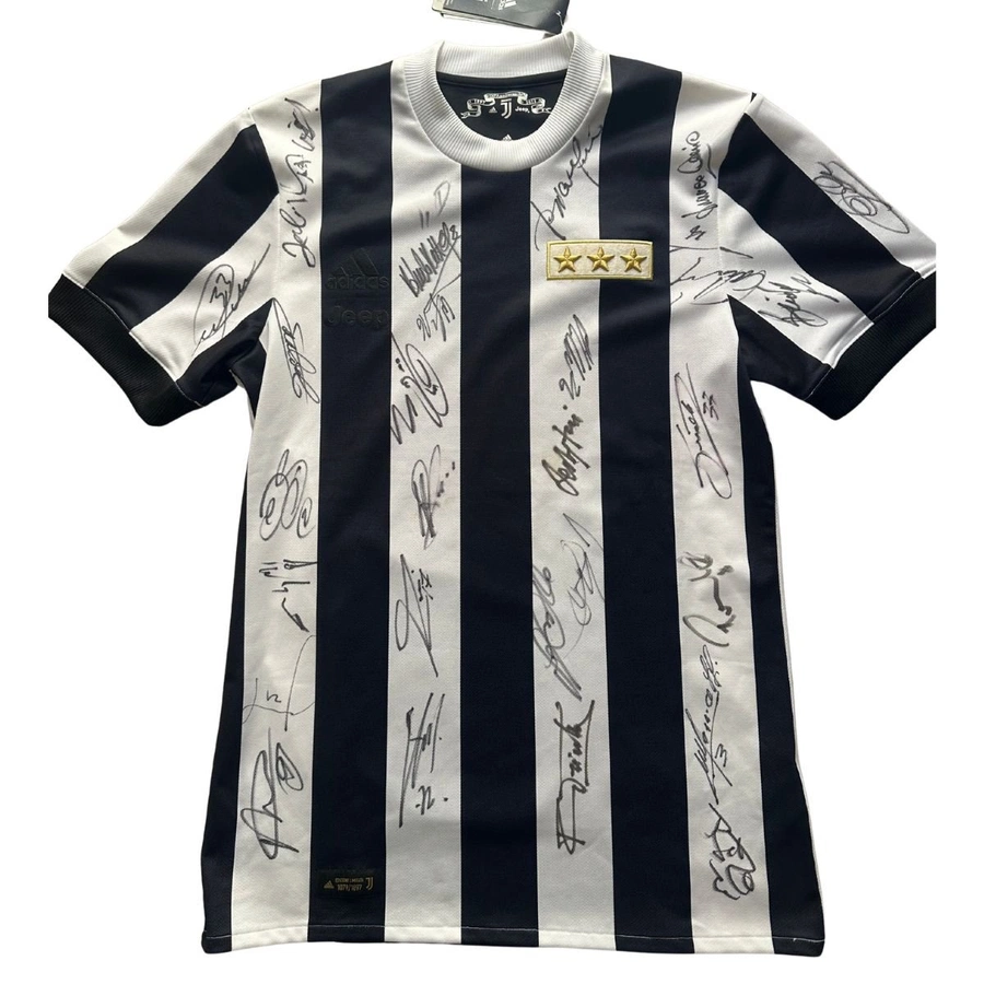The shirt has been autographed (as shown in the photo gallery) by: Stephan Lichtsteiner, Mattia De Sciglio, Mario Mandzukic, Stefano Sturaro, Wojciech Szczesny, Carlo Pinsoglio, Luigi De Agostini, Roberto Tricella, Romulo, Alessio Tacchinardi, Higuain, Mirko Vucinic, Gianluca Zambrotta, Christian Vieri, Mauro Camoranesi, Moreno Torricelli, Nicola Legrottaglie, Giorgio Chiellini, Sergio Brio, Roberto Bettega, Jose Altafini, Padovano, Franco Causio, and Gianluca Pessotto.