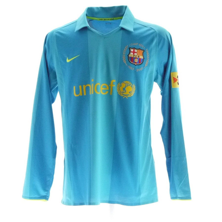 On the chest, the classic Barça crest — framed by a special inscription commemorating the club’s centenary: 1899–2007. A detail that elevates it beyond sport — into memory, into legacy. A silent witness to Ronaldinho’s final dance in Catalonia, when the magic began to give way to myth.