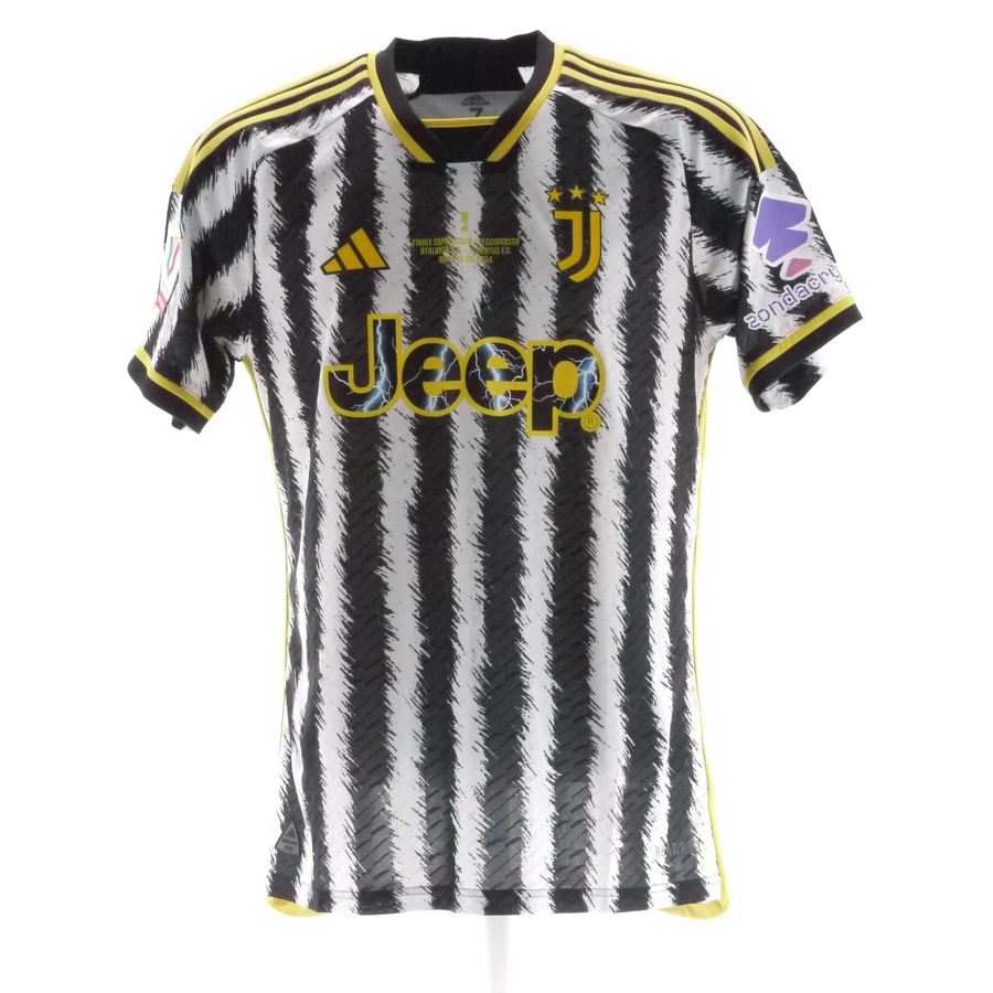 La maglia gara della Juventus preparata / indossata da Rabiot nella partita di Coppa Italia contro l'Atalanta giocata il 15/05/2024, valida per la finale di Coppa Italia, stagione 2023/24.