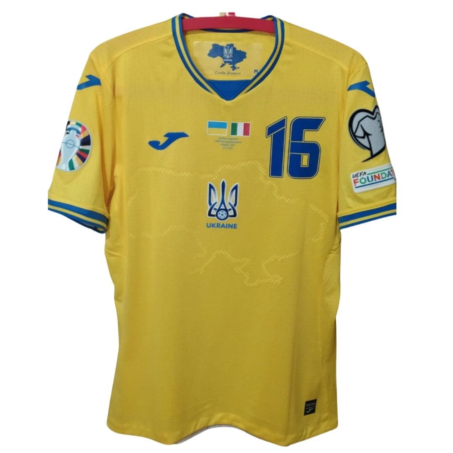 Maglia gara dell'Italia preparata / indossata da Mykolenko nella partita contro l'Italia giocata il 20/11/2023 alla Bay Arena di Leverkusen, valida per le qualificazioni a Euro2024.