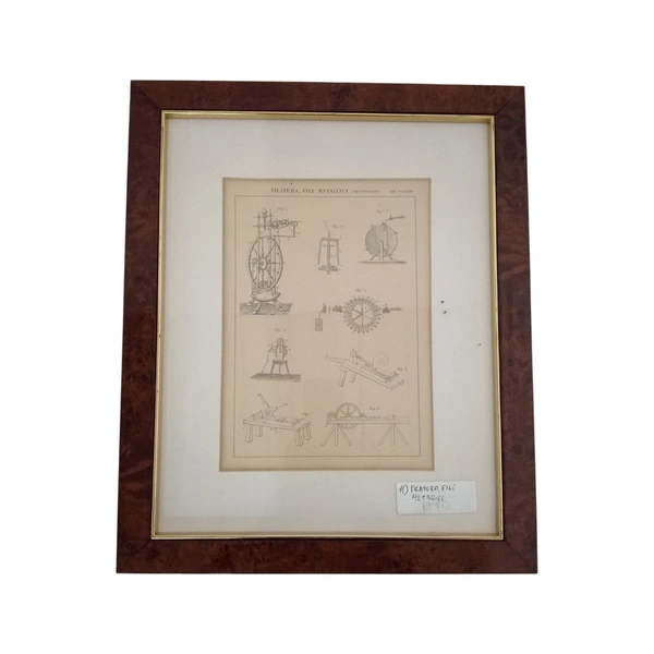 - Cornice di Prestigio: L'incisione è presentata in una cornice piatta in legno con finitura radica (o radica sintetica), lucida e ricca di venature. La cornice è impreziosita da un bordo interno dorato, creando un contrasto elegante con il soggetto tecnico.