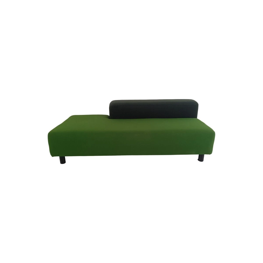 - Contrasto Cromatico Audace: Il corpo principale della seduta è rivestito in un tessuto robusto di colore verde brillante o prato, mentre il blocco dello schienale è rivestito in un tessuto nero o grigio scuro. Questo contrasto bicolore è un elemento chiave del suo stile contemporaneo.