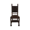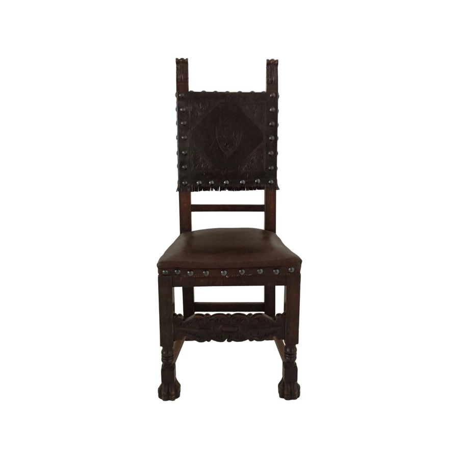 Questa sedia è un pezzo d'epoca di grande carattere, che evoca lo stile robusto e decorativo tipico dell'arredamento di ispirazione Rinascimentale, Savonarola o Rustico Spagnolo. È l'elemento ideale per aggiungere un tocco di teatralità e storia a uno studio, un ingresso o una sala da pranzo.