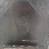 - Rivestimento in Pelle Borchiata: Sia il pannello centrale dello schienale che la seduta sono rivestiti in pelle o cuoio di colore marrone scuro. La pelle dello schienale è decorata con un motivo a losanga (diamante) e un possibile stemma o motivo in rilievo.