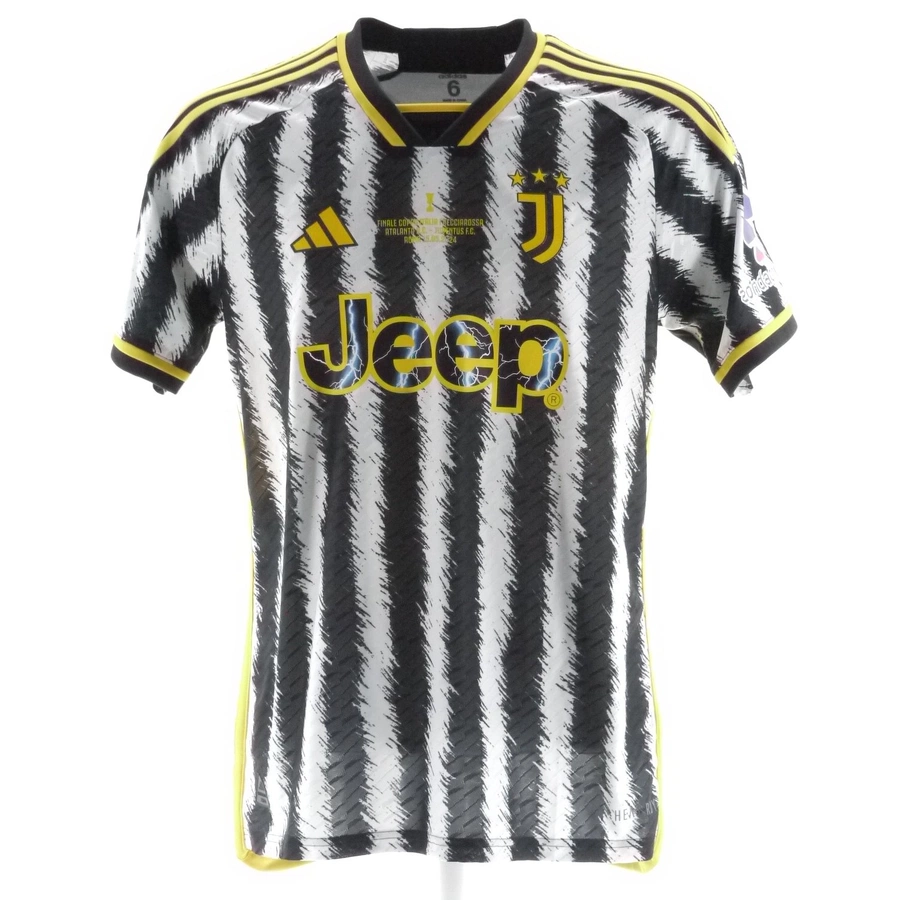 La maglia gara della Juventus preparata / indossata in panchina da Kostic nella partita di Coppa Italia contro l'Atalanta giocata il 15/05/2024, valida per la finale di Coppa Italia, stagione 2023/24.