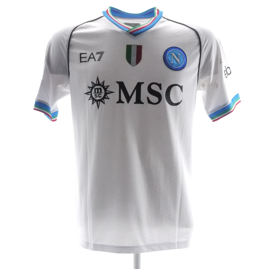 La maglia gara del Napoli preparata/indossata da Politano in una partita di Champions League, stagione 2023/24.