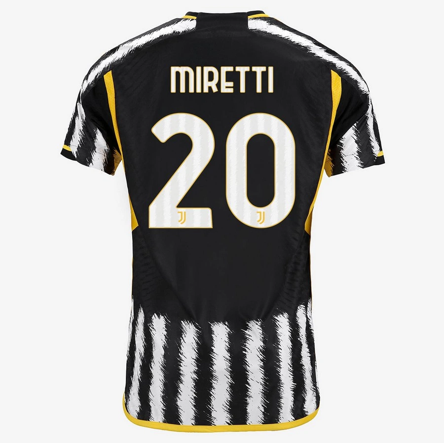 La maglia store della Juventus, stagione 23/24, personalizzata con nome e numero di Miretti autografata e con dedica personalizzata.