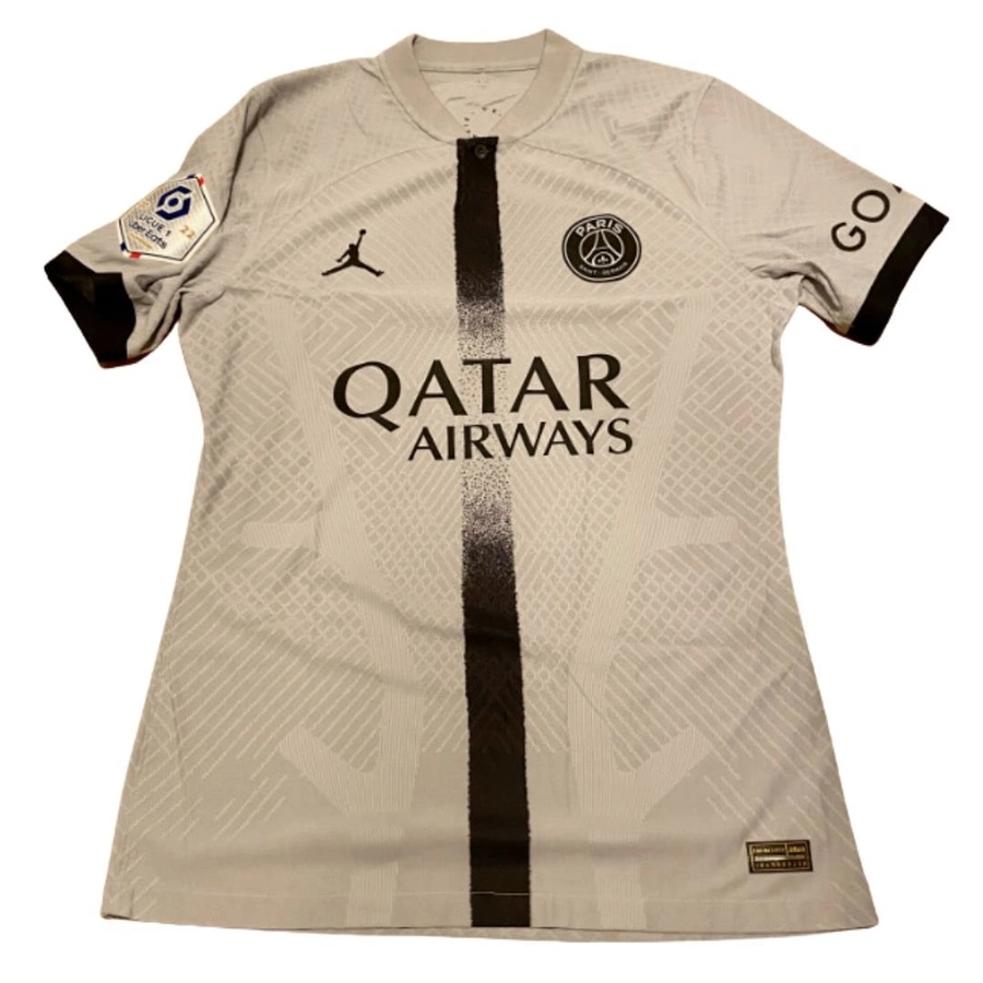 Maglia gara del Paris Saint Germain preparata / indossata da Mbappè in occasione di una partita della Ligue1, stagione 2022/23.