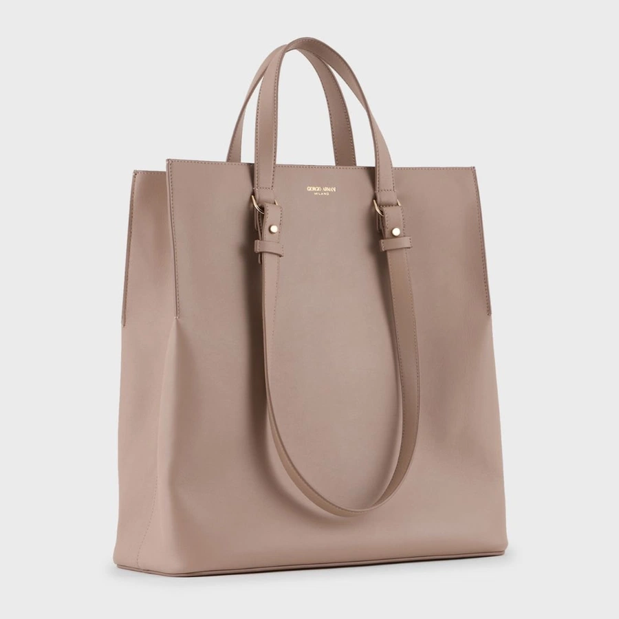 Shopping bag Giorgio Armani caratterizzata dalle linee geometriche e lineari. Realizzata in vitello con doppio manico, logo stampato a fuoco.
