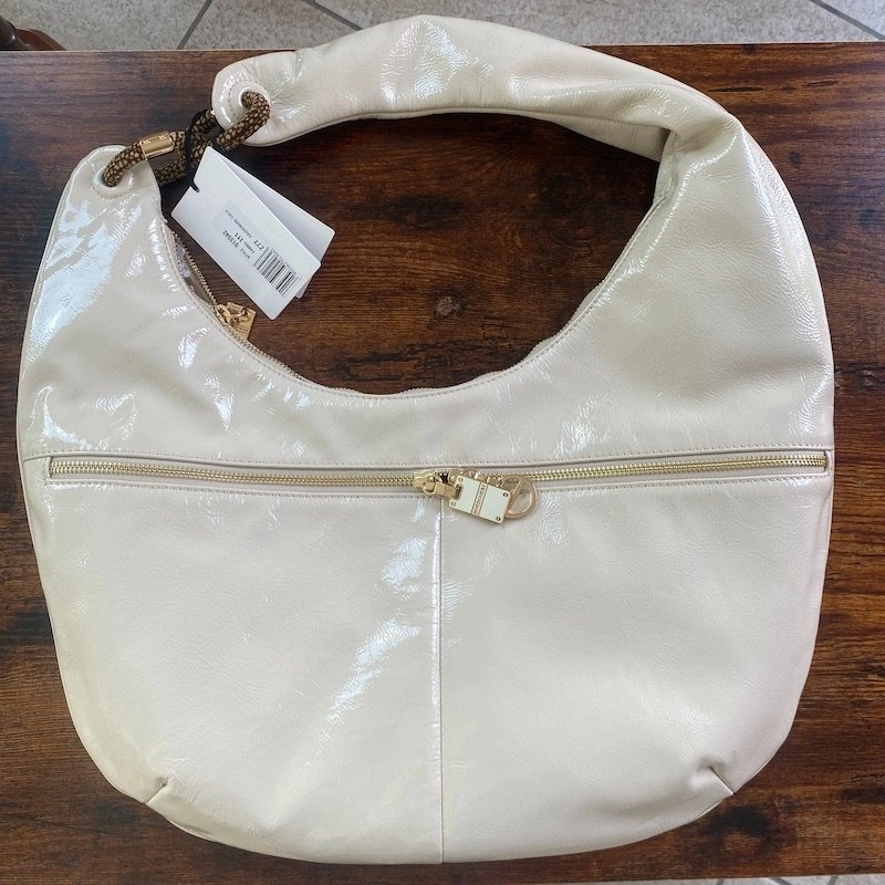 Borsa in pelle di vitello vernice Naplack ed anelli intrecciati ricoperti di Camoscio OP.