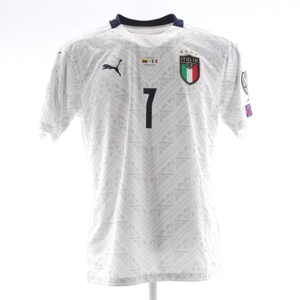 La maglia gara dell'Italia preparata / indossata da Pellegrini in occasione della partita di qualificazione al Mondiale 2022 contro la Lituania giocata il 31/03/21, stagione 2020/2021.