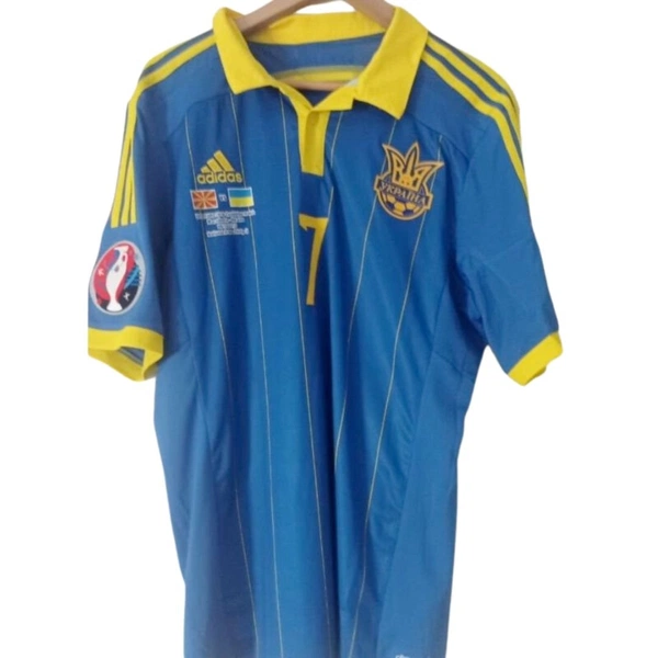 Maglia gara dell'Ucraina preparata / indossata da Yarmolenko in occasione della partita di qualificazioni ad Euro2016 contro la Macedonia del Nord giocata il 9/10/15, stagione 2014/15.