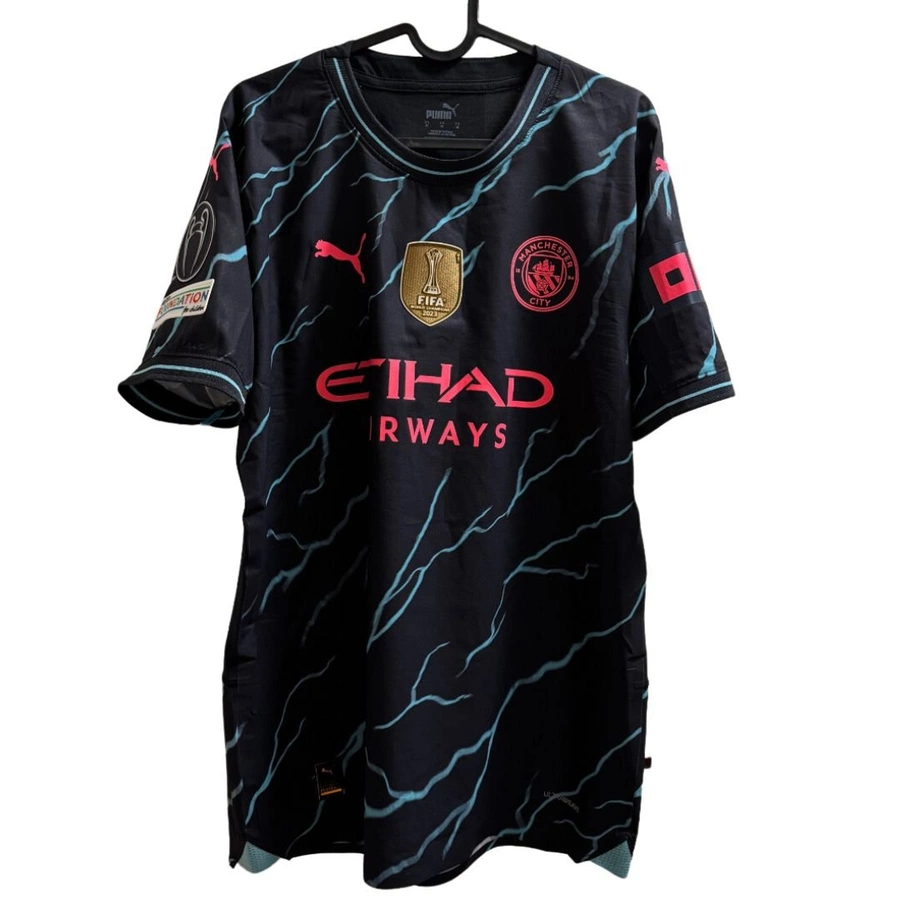 Maglia gara del Manchester City preparata / indossata da De Bruyne in occasione di una partita di Champions League, stagione 2023/24