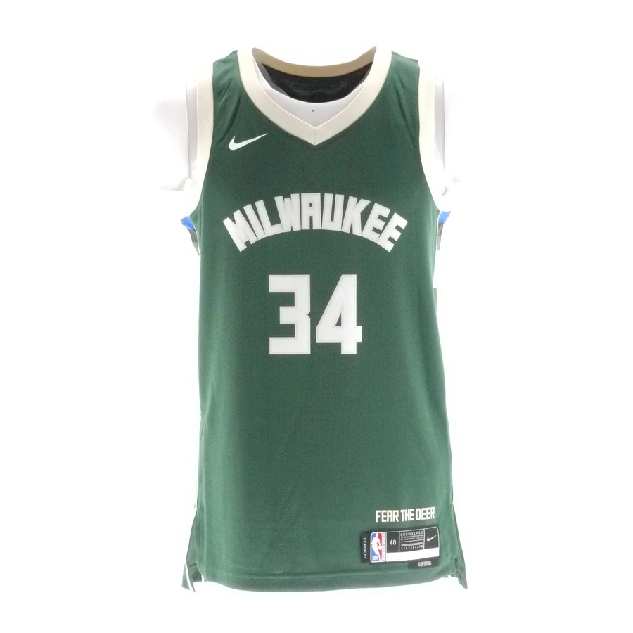 Canotta store dei Milwaukee Bucks personalizzata con nome e numero di Antetokounmpo.