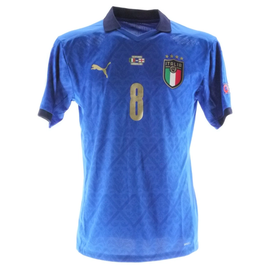 La maglia gara dell'Italia preparata / indossata da Jorginho in occasione della Finale di Euro2020 giocata contro l'Inghilterra l'11/07/21, stagione 2020/21.