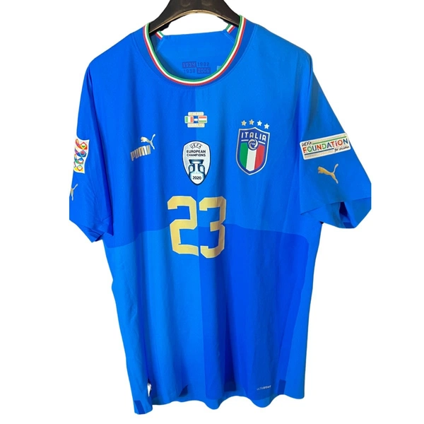 Maglia gara dell’Italia preparata / indossata da Bastoni occasione della partita di Nations League contro l'Ungheria giocata il 7/06/22, stagione 2021/22