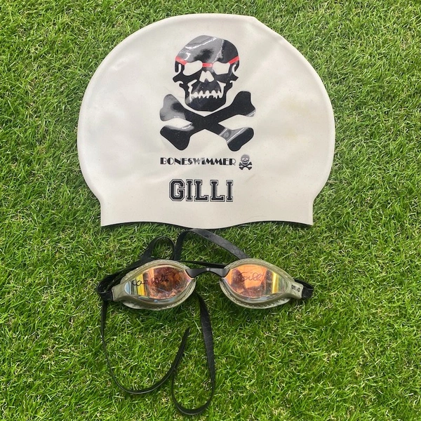 La cuffia e gli occhialini gara preparati / indossati da Gilli. La cuffia e gli occhialini sono stati donati da Carlotta Gilli per sostenere la campagna di Stelle nello Sport.