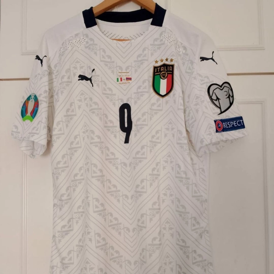 Maglia gara dell'Italia preparata / indossata da Belotti in occasione della partita di qualificazione agli Europei contro l'Armenia giocata il 18/11/19, stagione 2019/20.